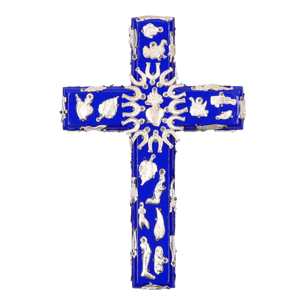 3D wall decoration in the shape of a cross with a flaming heart in the center, embellished with a hand-painted floral design and unique Milagros devotional pendants. The cross is a powerful cosmic symbol, representing the circle of nature's energies: it connects the earth to the sky and the west to the east. A precious amulet to protect your home. Each piece is unique. Ex Votos - Lucky Charms.
