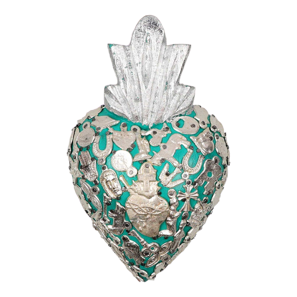Wall decoration with a flaming 3D heart, completely adorned with gold or silver-plated Milagros devotional pendants, applied by hand and nailed to the wooden base. Ex Voto - Good Luck Charms.