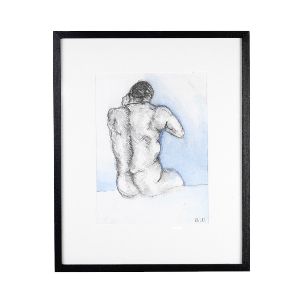 In The Man, Rhed depicts a male nude from behind with essential, vibrant strokes. Rapid lines define the structure of the body, while the light, nuanced blue background envelops the figure in a silent, intimate atmosphere. The artist does not seek anatomical perfection, but rather the emotional presence of the subject: a body that conveys strength, vulnerability, and humanity.