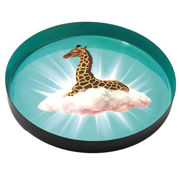 This tray by Gangzai perfectly embodies the brand's poetic and surreal vision, transforming an everyday object into a unique decorative element. With its 33 cm diameter, it is ideal both for stylish serving and for enriching spaces with an original touch. The design depicts an elegant giraffe emerging from a soft cloud, surrounded by luminous rays: a scene suspended between dream and reality, capable of captivating the eye and stimulating the imagination. Crafted from iron with an enameled finish, it is a handcrafted product with meticulous attention to detail. The handmade craftsmanship makes each piece unique, with slight variations in color and print that underscore its authenticity and value. Perfect on a side table, in the kitchen, or even hung on a wall, for those who appreciate decorative objects that are unconventional and full of personality.