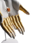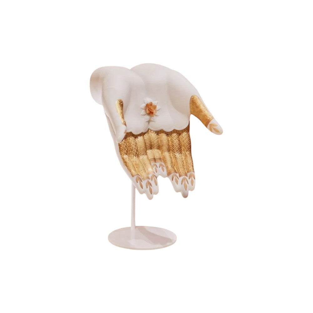 The porcelain sculpture "Abundance Mudra" interprets one of the most evocative sacred gestures of yoga and meditative practices of Hinduism and Buddhism. This piece celebrates the Mudra of Abundance through a finely modeled hand decorated with geometric and plant motifs precisely engraved on the fingers, restoring a balance between spirituality and artistic refinement.The engravings are embellished with different shades of golden luster, alternating enamel and matte finishes that give depth and brightness to the surface. With dimensions of 32x23x24 cm, the sculpture stands out as an important and meditative decorative element. Modeled by sculptor Virginia González and launched in 2024, it comes with a warranty and free insurance valid for one year, allowing replacement at no additional cost in the event of breakage. An elegant and symbolic work, perfect for those who want to enrich their spaces with an object full of meaning and beauty.