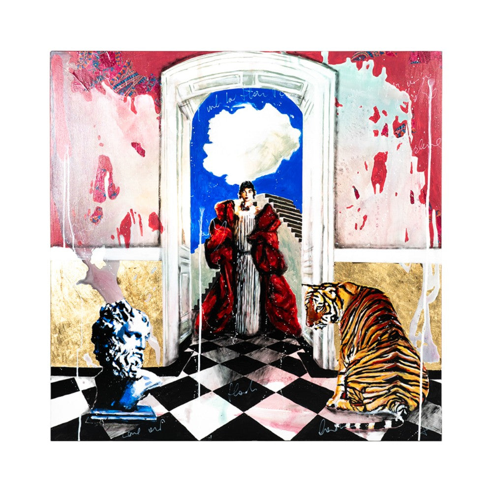 In Apocalypse (2025), Sante Muro imagines a scene suspended between myth, fashion, and vision. A regal figure emerges from a celestial portal, while classical and animal elements, such as the sculptural head and the tiger, construct a symbolic theater of power and metamorphosis. Gold, chromatic ruins, and instinctive pictorial gestures evoke an apocalypse understood as revelation, between elegance and unease.
