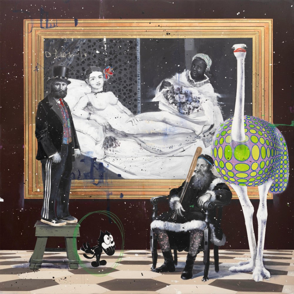 In Edouard’s Crime, Angelo Accardi engages directly with art history: at the center stands a clear reference to “Olympia”, reinterpreted in black and white and encased in a heavy golden frame. A small red flower placed on the reclining figure’s ear becomes the only color piercing through the monochrome classic. In front of the painting, a series of anachronistic and ironic characters appear.On the left, a bearded man in a top hat wears an elegant jacket paired unexpectedly with sporty trousers, creating a humorous clash between 19th-century formality and contemporary streetwear. At his feet, Felix the Cat in his traditional cartoon style acts as a silent pop narrator. On the right side, a seated figure dressed in fur-trimmed garments holds a long wooden staff, watching the scene like a stern guardian of this imaginary museum. Beside him stands one of Accardi’s signature surreal animals, a tall ostrich with a patterned, optical-style body in green and purple, a deliberate disruption of the scene’s balance. The geometric flooring and dark background frame the space between aristocratic salon and contemporary exhibition hall.Edouard’s Crime becomes a witty confrontation between canonical art, historical memory, and pop imagery, staged as a single, hybrid tableau where every element speaks on equal terms.