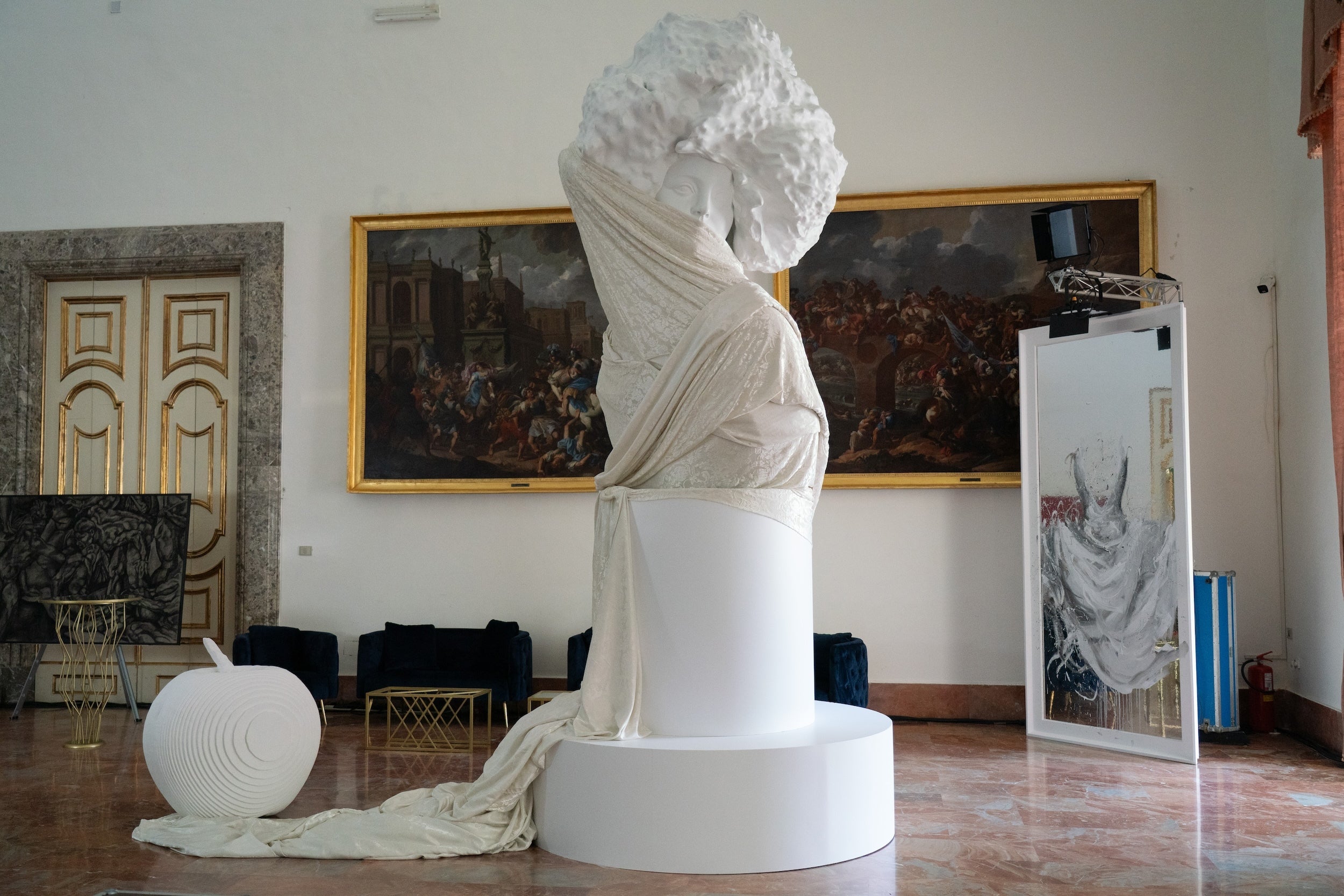 The artists featured in the evening joined forces, combining traditional and alternative materials and playing with shiny surfaces, transparencies, and reflections to amplify the message. Angelo Accardi's white lacquered resin, which gives the sculpture a marble-like appearance, is complemented by Luca Bellandi's painting on Plexiglas, reflected by a mirror, in an optical illusion of transformation created by the superimposition of the painting on the sculpture's drape. Daniele Fortuna works with wood, which, with its layered shapes and vibrant colors, adds further three-dimensionality to the scene. The work is called “Venus” and rests on a scenographic carpet created by the Saints Studio brand, a fashion house close to the world of art: a 10-meter-long silk patchwork that recalls the link between art, fabric, and history. It is on display in the Romanelli Room of the Royal Palace of Caserta, a world-famous UNESCO jewel, as part of a concession of space for a fee. A crossroads of contemporary art and social commitment where Venus is a symbol of emancipation and gender equality. Standing 4 meters tall, it is a tribute to the “black Venuses” and a universal manifesto. The Afro hairstyle celebrates the women who have marked the history of the struggle for gender equality. The mouth, on the other hand, wrapped in a white veil that ends on a symbolic apple, echoes original sin and the stigma imposed on women throughout history.