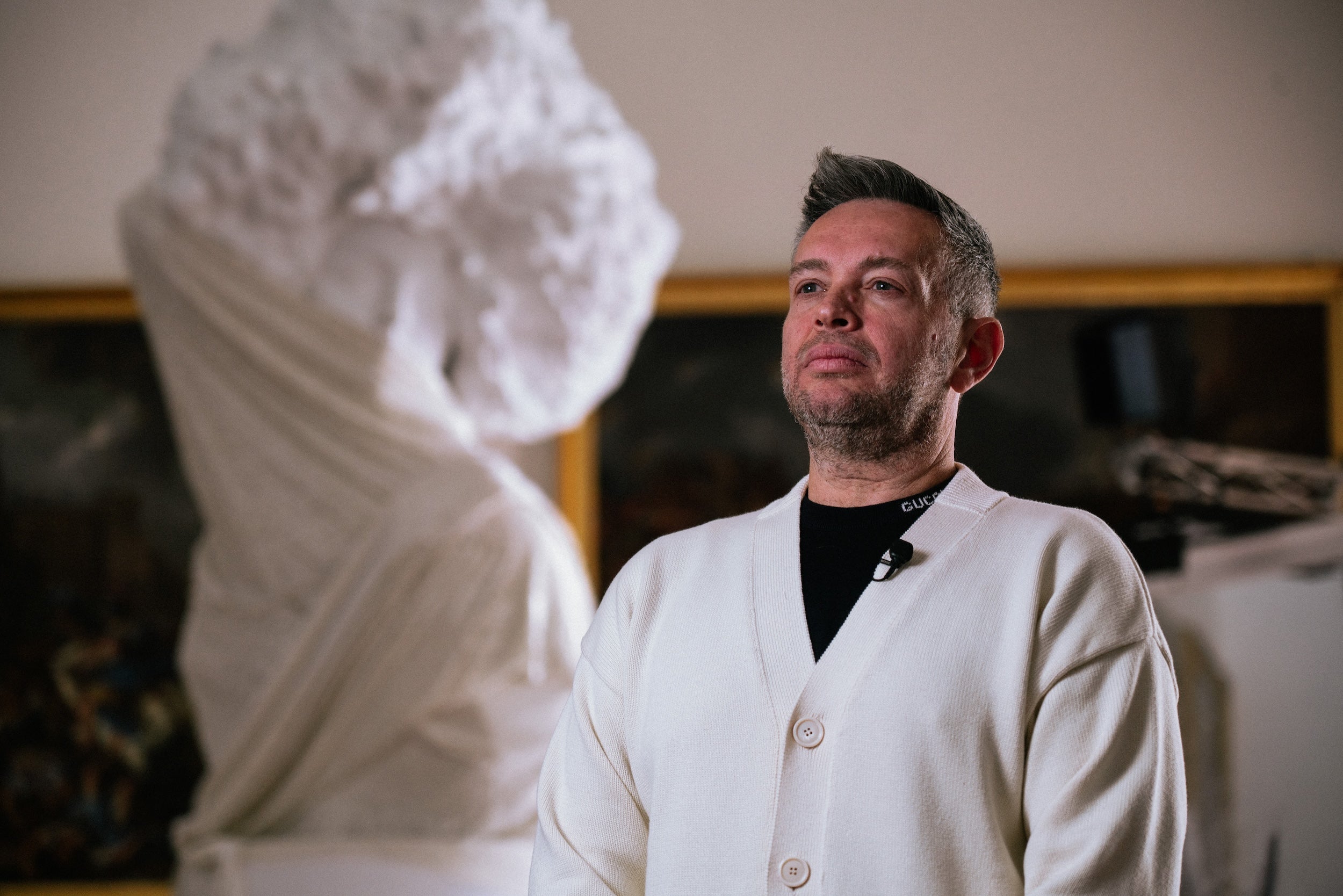 A questi si unisce il legno di Daniele Fortuna che, con le sue forme stratificate e i colori vibranti, dona ulteriori tridimensionalità alla scena e all’installazione stessa, poggiata sul tappeto scenografico di Saints Studio, maison di moda vicina al mondo dell’arte: un patchwork di seta lungo 10 metri posto ai piedi della Venere per richiamare il legame tra arte, tessuto e storia.