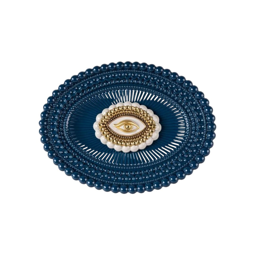 The "Lover's Eyes" porcelain tray is an elegant piece of furniture belonging to the collection of the same name, inspired by an ancient tradition. Made of fine porcelain with a brilliant finish and gold details, it features a refined palette in shades of white, blue and gold, which gives the piece an artistic and decorative character. Designed by Susana Rodriguez and modeled by the sculpture team of the Dept. Diseño y Decoración, this tray combines craftsmanship and aesthetic refinement, transforming a functional object into a piece of furniture with a strong visual impact.The tray has dimensions of 34x26x6 cm, making it ideal for display on tables, sideboards or consoles. Launched in 2023, it is a piece designed to last over time, further enhanced by an included warranty and free one-year insurance that allows replacement at no additional cost in the event of breakage.