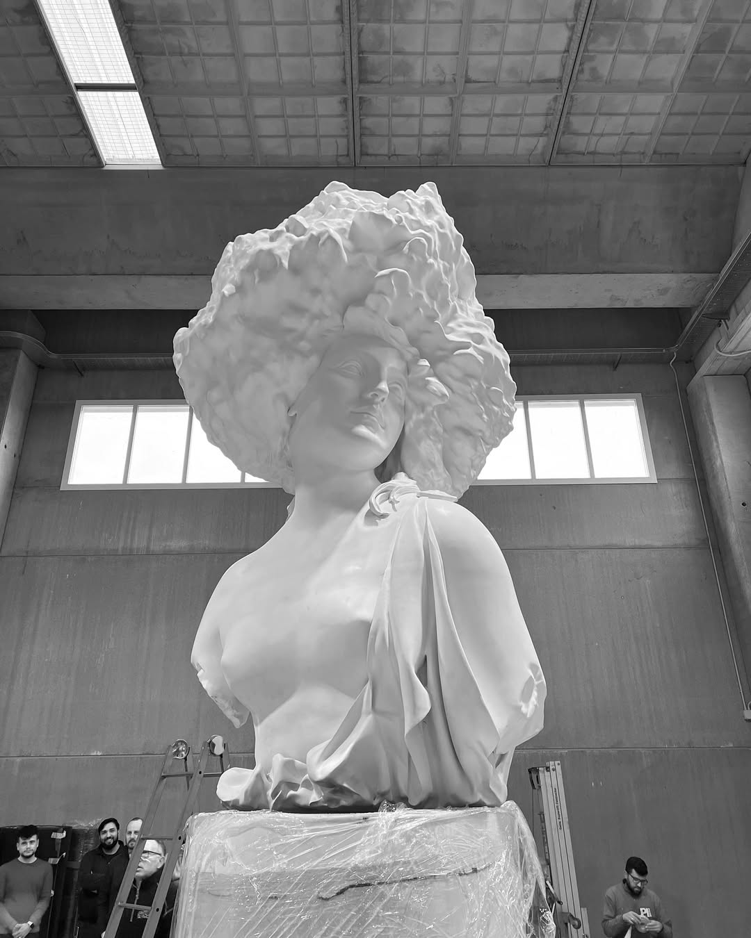 Una Venere che non nasce dalla spuma del mare, ma dall’unione di visioni, materiali e anime artistiche. Quattro voci, apparentemente distanti, si fondono in un’unica opera: la resina di Accardi, che le regala una forza scultorea; lo specchio di Bellandi, che rifrange lo sguardo di chi osserva; la tridimensionalità pop di Fortuna, che la scolpisce nel colore; e il tappeto in seta firmato Saints Studio, un patchwork lungo dieci metri.