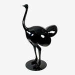 The statue of a large ostrich, entirely in black, seems to step out of the space in which it is placed, creating a strong visual impact. Its monumental presence gives us a feeling of bewilderment, combined with the elegance that emerges from the finesse with which it has been made.