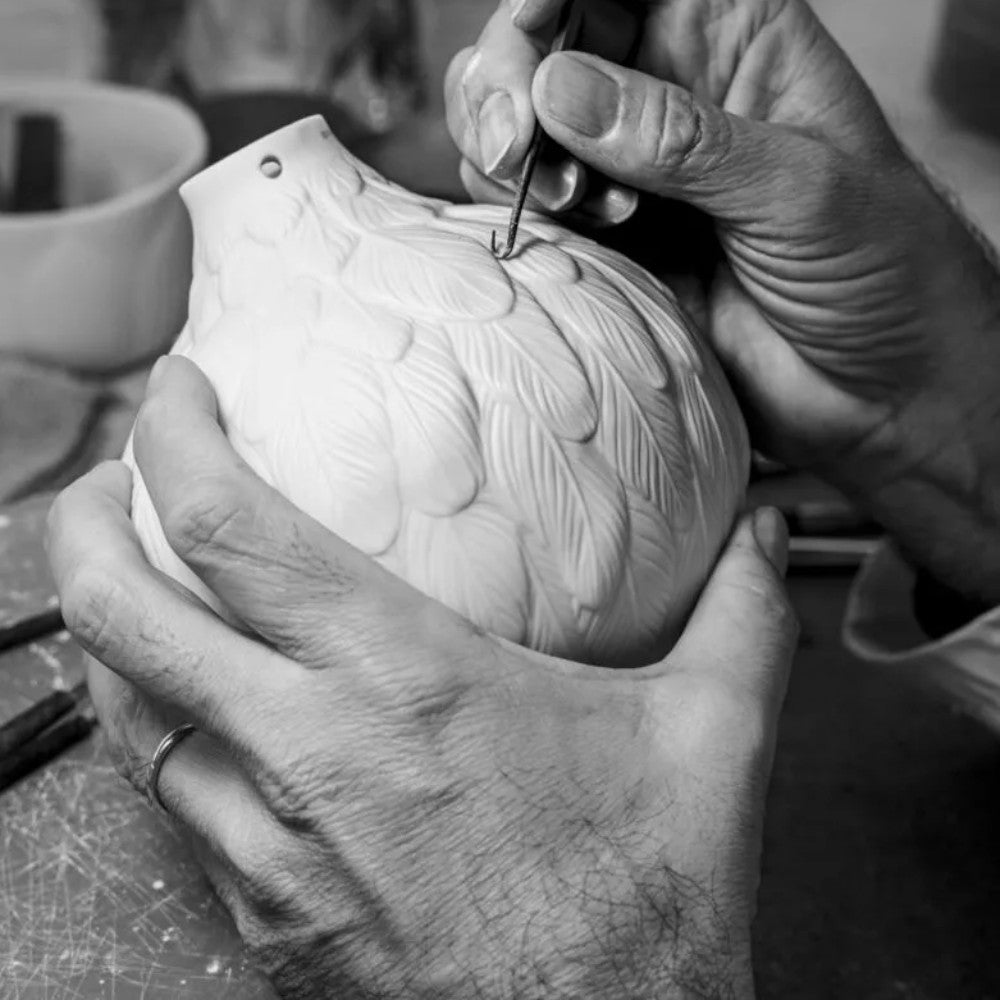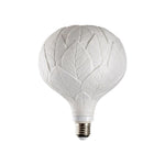 The "Quercia" porcelain lamp reinterprets the classic shape of the bulb, transforming it into a luminous object with a natural and refined design. Belonging to the A Bright Idea collection and designed by Marcantonio Raimondi Malerba, it blends art, nature and functionality through elegant oak leaves in bas-relief which, when illuminated, reveal a vibrant texture and a warm play of shadows. Designed to combine creativity and technology, it includes an E26/E27 adapter compatible with G9 LED bulbs, offering sustainable and versatile lighting. With dimensions of 20x15x15 cm, it is perfect for display on coffee tables, bedside tables or shelves, adding a poetic touch to interior decoration. Launched in 2025 and modeled by the Dept. Diseño y Decoración team, it represents an ideal combination of contemporary craftsmanship and aesthetic sensibility.
