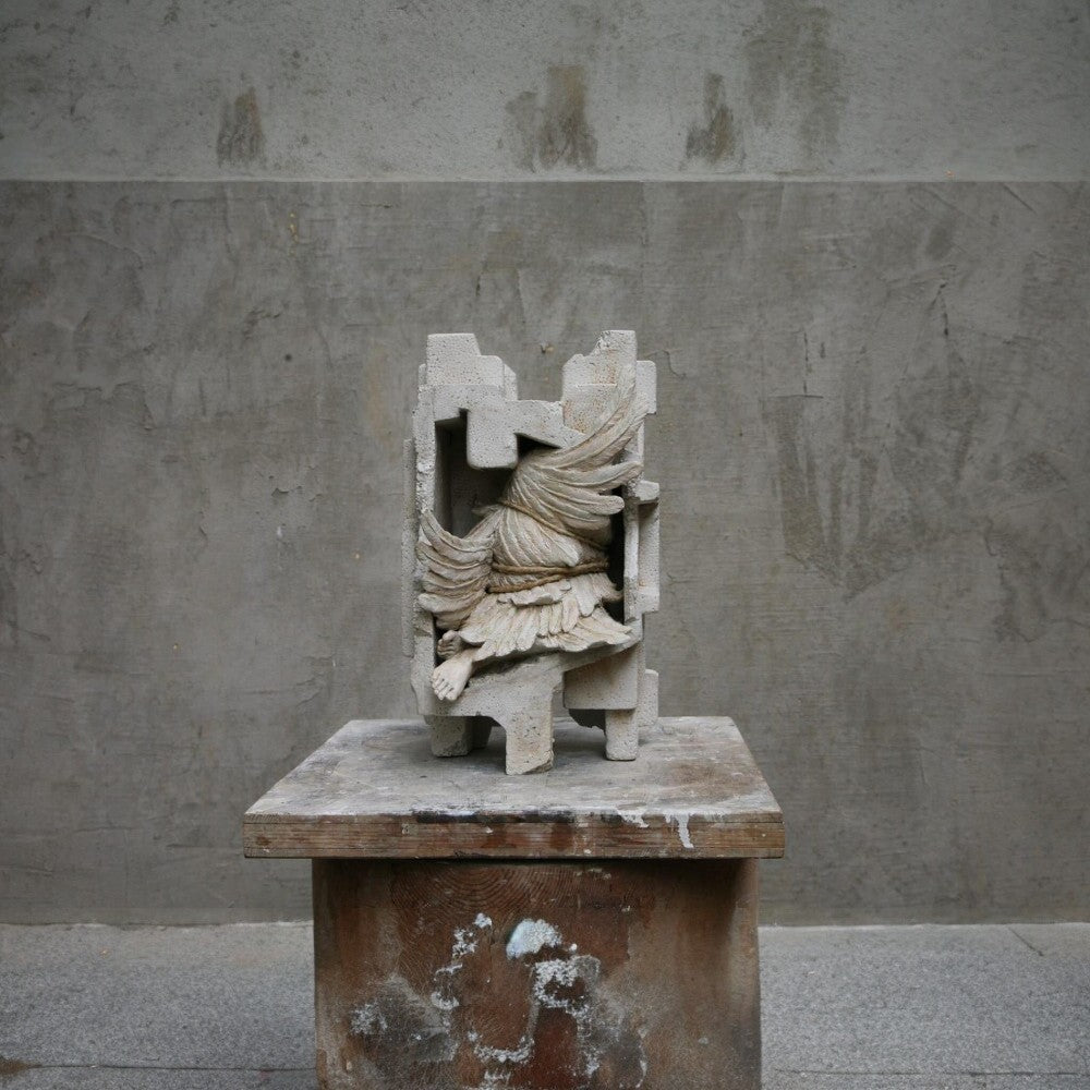 In Wrapped n.4, Daniele Accossato traps a fragment of a winged body inside a rigid shell, similar to an industrial packing case. The bare foot and feathers struggle to emerge through the block’s interlocking shapes, revealing a figure trying to expand within a space that restrains it.