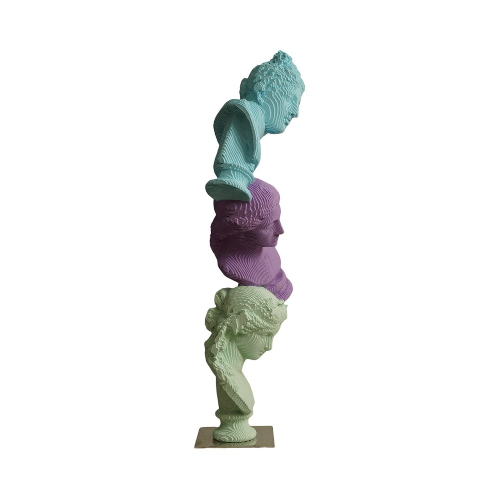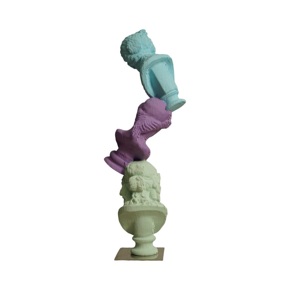 Three busts overlap in a bold, almost impossible balance, returning a vertical composition of classical faces reinterpreted in a pop key. The pastel colors - mint green, purple and light blue - amplify the work's alienating effect, while the fluted material, typical of Fortuna's language, creates a visual rhythm that breaks its static nature. The three figures, though different, support each other, evoking a poetic tension between strength and fragility. A dialogue between tradition and contemporary irreverence.