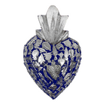 Wall decoration with a flaming 3D heart, completely adorned with gold or silver-plated Milagros devotional pendants, applied by hand and nailed to the wooden base. Ex Voto - Good Luck Charms.
