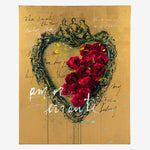 "Amor Errante" by Luca Bellandi is a work that mixes symbolism and feeling. In the center, a heart encloses the most intimate aspect of the artist, between red roses full of passion and words that seem suspended in time. The ancient frame and the golden background give the scene a timeless air, where love and nostalgia intertwine in an emotional and visionary journey.