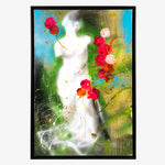 In Mythe Fantome, the figure of a statue emerges bursting in the background, while the splashes of paint and abstract roses invite us to go beyond the visible. The statues, motionless and solemn, contrast with the dynamism of the sketches, creating a work in which the apparent static nature is shaken by the movement and energy of the composition.