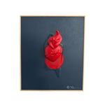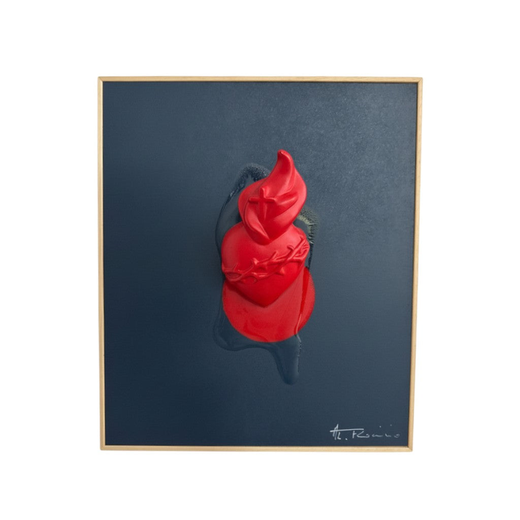 The Sacred Heart is deeply rooted in our culture: a symbol of religion, but above all of belonging and tradition. Flaminio presents it to us with a crown of thorns at the center and a play of shadows representing flowing blood. The Sacred Heart, covered in red, represents ardent love, the blood shed by Christ for salvation, martyrdom, and the fire of the Holy Spirit that inflames, evoking passion, sacrifice, and total self-giving.