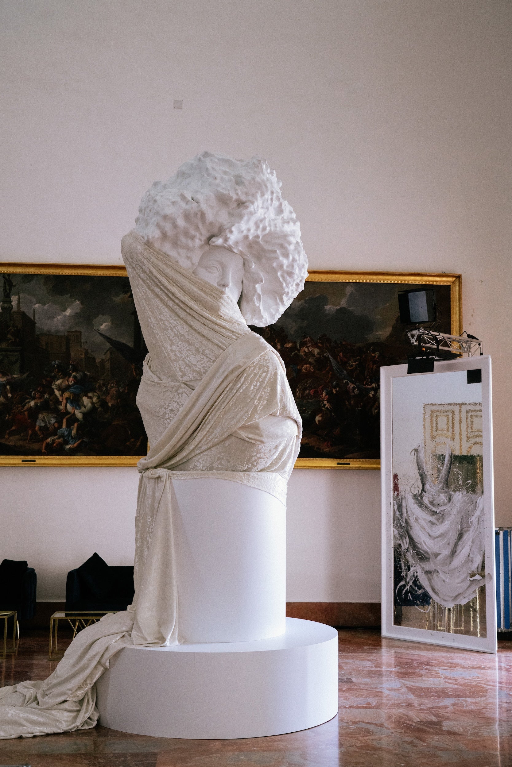 Un progetto contemporaneo e “a sei mani”, studiato per combinare materiali tradizionali e alternativi, giocando con superfici lucide, trasparenze e riflessi per amplificare il messaggio. Alla resina bianca laccata da Angelo Accardi, che conferisce un aspetto marmoreo alla scultura, si aggiunge il dipinto su plexiglass di Luca Bellandi, riflesso da uno specchio, in un’illusione ottica di trasformazione creata dalla sovrapposizione el dipinto al drappo della scultura.