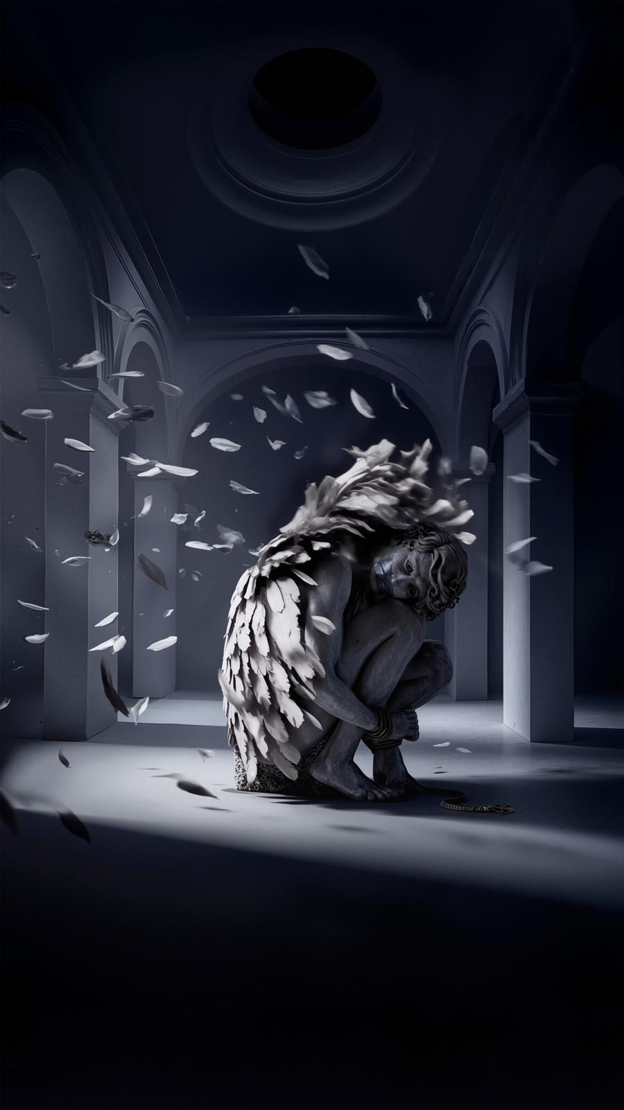At the center of the composition is a figure curled up on itself, almost contracted, covered with a mantle of feathers that act as armor and at the same time as a sign of vulnerability. The feathers are not ornamentation, but living matter, charged with ambiguous meanings: lightness and falling, defense and abandonment. Around the figure, the architectural space is silent, rarefied, like a ritual chamber in which the gesture of love is transformed into a secret, guarded act.
