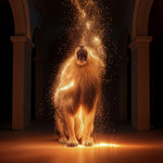 The work depicts an animal figure enveloped in an ascending flame, suspended in a solemn and silent architectural space. Fire is not destruction, but manifestation: a column of light and incandescent particles rising from the body, like a soul taking shape through heat. The sparks become minimal visual units, traces of a continuous movement between the material and the immaterial.