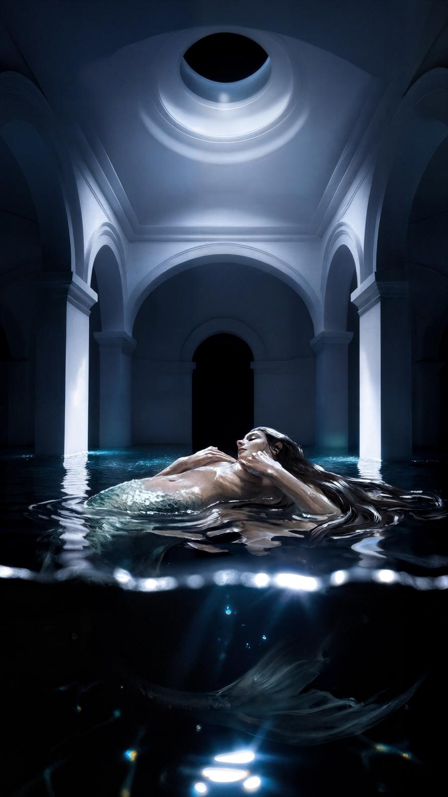 The scene takes place within a classic, solemn, and silent architectural space, transformed into a pool of dark, reflective water. A female figure emerges and floats on the surface, in a state of abandonment and absolute stillness. The body is not a narrative protagonist, but a symbolic vehicle: it becomes soul, liquid presence, embodied memory.